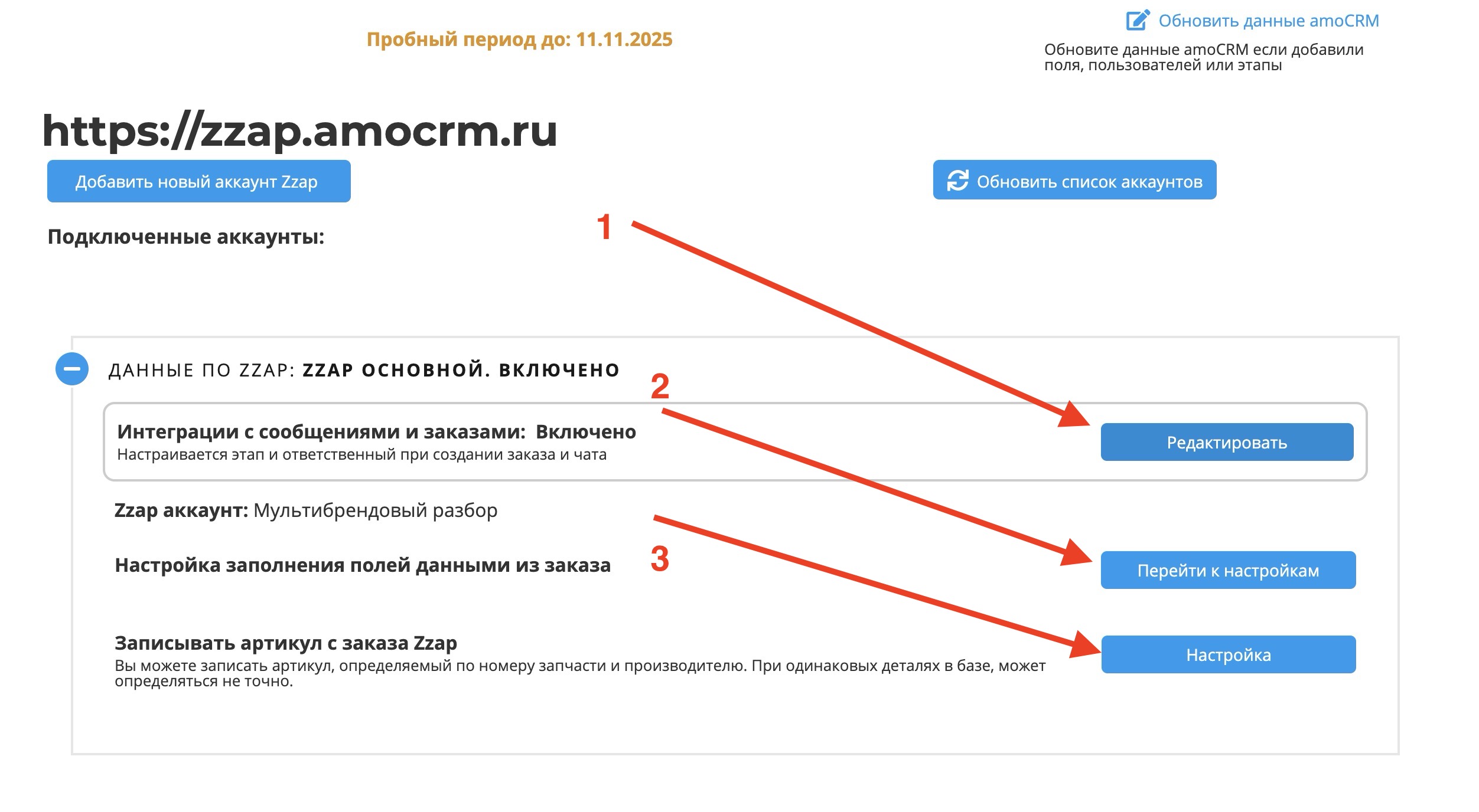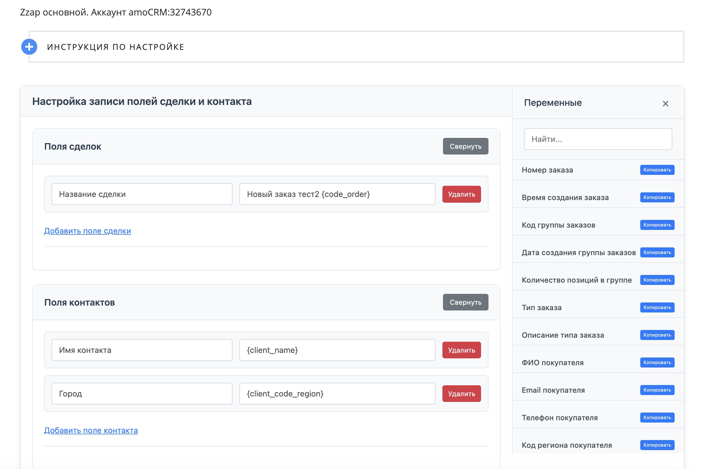 4. Вы можете настроить заполнение полей amoCRM данными из заказа Zzap, для этого нужно нажать на кнопку 2 "Перейти к настройкам", на открывшейся странице будет подробная инструкция.