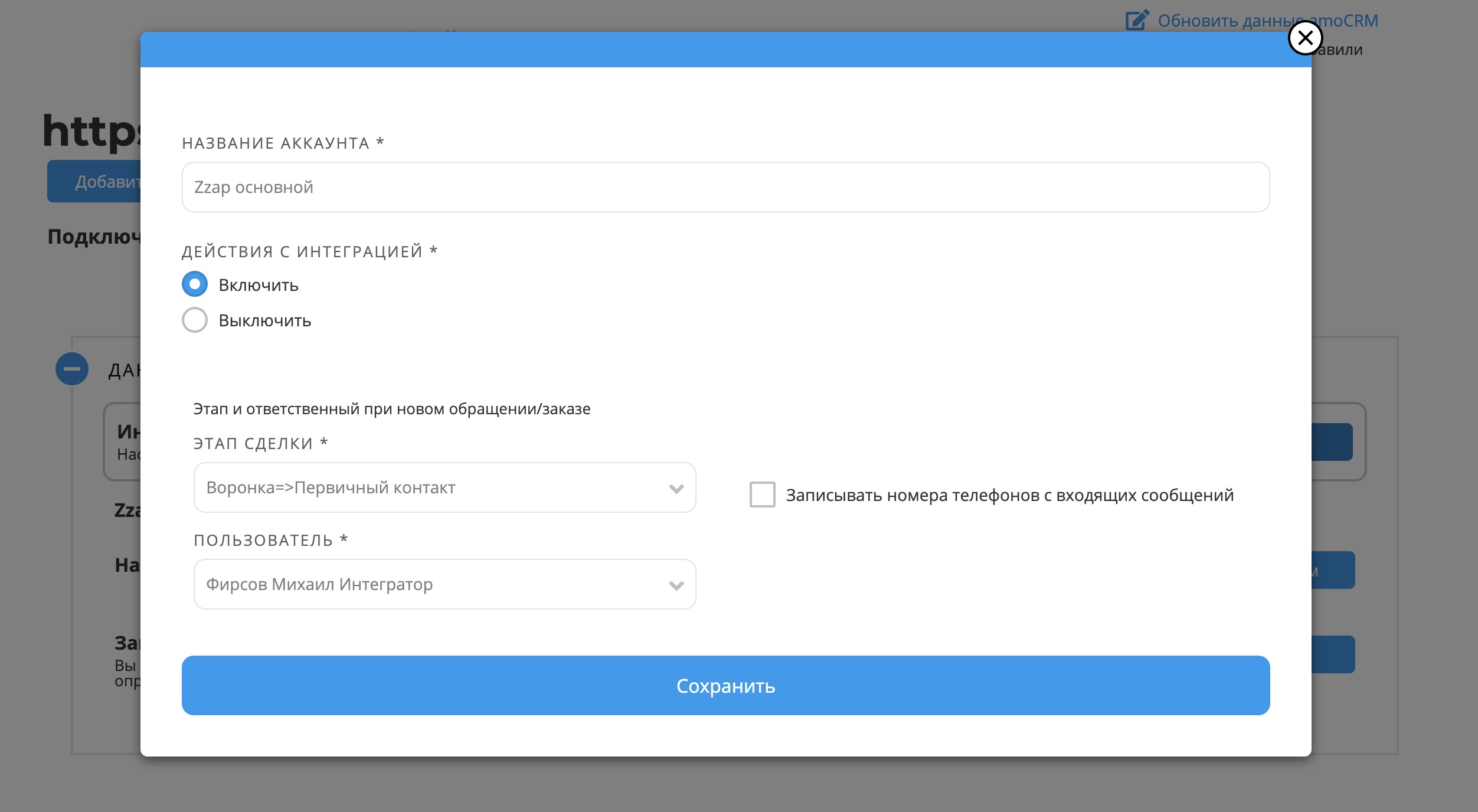 3. После авторизации необходимо включить прогрузку сообщений и заказов. (При первом включении загрузится последние 30 диалогов и последние 30 заказов). Нажмите кнопку 1 "Редактировать" укажите воронку создания сделок и ответственного пользователя.